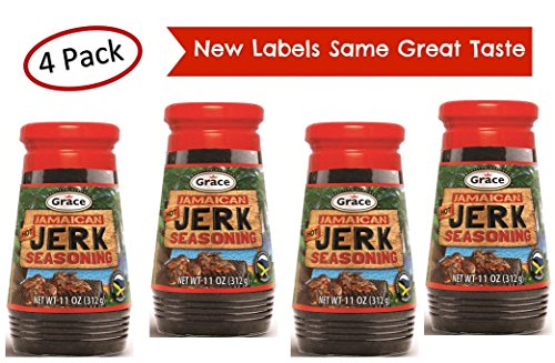 Grace Jerk Seasoning – Hot – 4 Pack 10 oz – Spicy Authentic Jamaican Jerk Sauce – Caribbean Marinade Rub for Chicken, Pork, Fish, Vegetables, Steak, Tofu and More – Bonus Jerk Cooking Recipe eBook