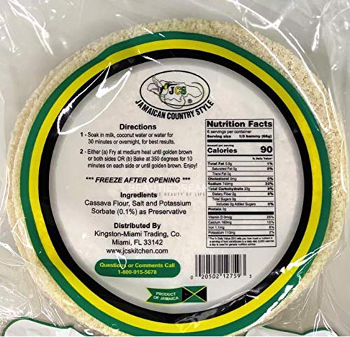 JCS Brand Jamaican Bammy Cassava Cakes. Includes 8 individual cakes. Directions: 1. Soak in milk, coconut water or water for 30 minutes or overnight, for best results. 2. Either (a) Fry at medium heat until golden brown on both sides OR (b) Bake at 350 degrees for 10minutes on each side or until golden brown. Enjoy!