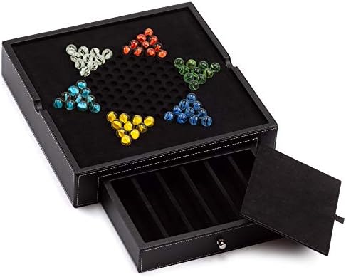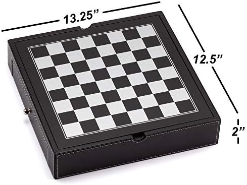 Our 4-in-1 Chess, Checkers, Backgammon, and Chinese Checkers Board Game Combo Set is made from black leatherette, with two drawers on the sides to store the game pieces. One of the drawers has built in dividers to easily store the Chinese checker pieces without them rolling around. The other drawer has no dividers, so you can easily store the chess and checkers/backgammon pieces. The game combo set includes game box, complete set of 32 chessman, 30 pieces for backgammon/checkers games, two pairs of dice (4 total), a doubling cube, 60 glass marbles, and game instructions. The set has natural wood and dark brown wood chessmen. The board game dimensions are, 13.25 x 12.5 x 2 inches, inlaid chess board dimensions 1.25-inch squares. The chess piece sizes are: King height: 2.5 inch; Queen height: 2.125 inch; Pawn height: 1.125 inch. The backgammon/checker pieces dimensions are 0.83 inch in diameter, and glass marbles dimensions are 0.6 inch in diameter. Great for schools, home, travel, playrooms, game night, game room, office and so much more. For 3+ years old and up, ASTM and CPSIA test approved. Please verify that dimensions fit your needs before purchasing.