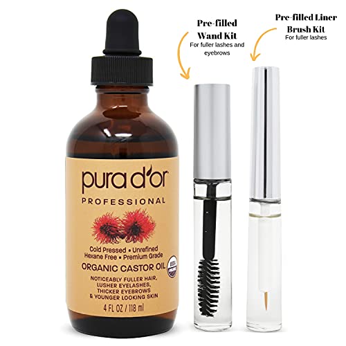 PURA D’OR Organic Castor Oil (4oz) 100% Pure Natural USDA Organic: Conceal Thin, Reveal Fuller Eyebrows, Thicker Eyelashes, Hair Growth: Cold Pressed Hexane Free-Moisturize Dry Skin w/Bonus Brush Kit