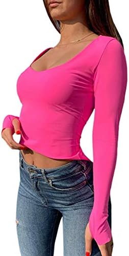SEMATOMALA Women’s Scoop Neck Bodycon Top U Neck Long Sleeve Skinny Shirts Solid Athletic Workout Slim Fitted Crop Tops