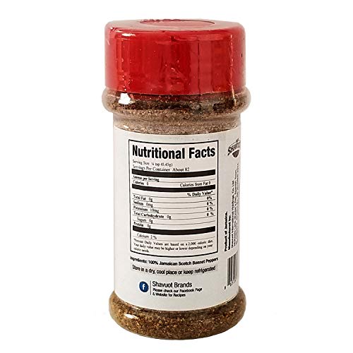 Use Shavuot Scotch Bonnet Pepper to add authentic and distinct Jamaican pepper “heat” and world-famous scotch bonnet pepper flavor to your Caribbean dishes. Try this pepper powder in your rice and peas dish or in seasoning your meat, fish and poultry. Each Shavuot Jamaican Scotch Bonnet Pepper Powder contains 1.3 ounce / 36.85 grams (Pack of 3). Use approximately 1/4 teaspoon for the flavor of one real scotch bonnet Jamaican pepper.