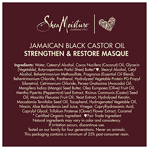 SheaMoisture Jamaican Black Castor Oil Strengthen and Restore Masque is a deep conditioning and hydrating hair mask that helps to strengthen and restore damaged or chemically processed hair. This hair mask and deep conditioner replenishes moisture and softens hair by supporting elasticity, reducing the appearance of breakage and shedding; it’s our best hair mask for curls. Our deep conditioning hair mask is perfect for those who regularly color, straighten, perm or heat style their natural hair. Formulated with Jamaican Black Castor Oil and Shea Butter, this deep conditioner hair masque strengthens damaged hair and chemically processed hair. All SheaMoisture hair products are sustainably produced and cruelty-free. This SheaMoisture hair mask is formulated with no silicones, no sulfates, no parabens, no phthalates, or petrolatum. These hair products, including this hair masque by SheaMoisture, have been tested on family and friends for generations and never on animals. Our Story: SheaMoisture is the legacy of Sofi Tucker, a pioneering mother of four and entrepreneur who sold Shea Butter, African Black Soap and homemade beauty preparations in Sierra Leone in 1912. We honor her vision by continuing to formulate with Raw Shea Butter handcrafted by women in Africa. With every purchase you show support of our mission to reinvest back in our communities.