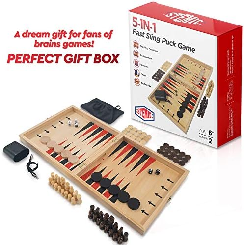 Stemic 5-in-1 Board Games For Adults and Family – Backgammon Set, Chess Board, Checkers, Tic Tac Toe, Sling Puck Game with 10 Pucks, 32 Chess Pieces, 30 Checkers Pieces – Premium Wood, Large, Foldable