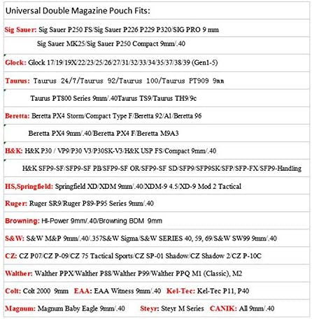 Universal Mag Holster: This double magazine holder fits most common pistol models with 9mm/.40/.45 double stack magazines – Glock 17/19/22/26/27/31/32/33/34/35/37/38/39 Gen 1/2/3/4/5; Beretta 92 M9A1/92FS/96/PX4 Storm; Browning HI-Power 9mm/.40; S&W M&P 9mm/.40/.357; Taurus PT92/PT800 Series 9mm/.40; Sig Sauer P320/P226; Colt 2000 9mm; Walther PPX PPQ; H&K P30/VP9; Springfield XD Tactical/XDM 9MM/40(Double stack magazine). For more models, please check the FIT magazines list.